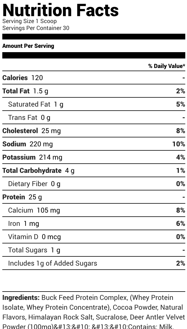 Premium Flavor. 25g Protein Per Serving. Just 4g Total Carbs. Buck Feed – Original Protein Formula. Dietary Supplement. 30 Servings Per Container. Naturally Flavored with Other Natural Ingredients.