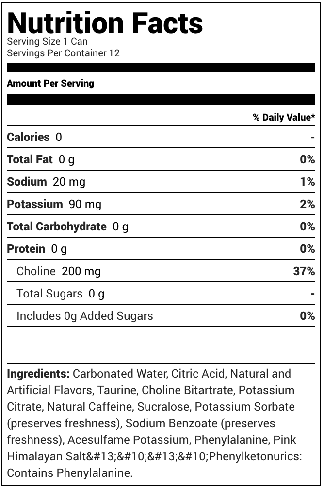 200mg Caffeine Energy Drink. 200mg Choline. Zero Sugar. Clean Energy From 200mg Natural Caffeine. Intense Focus From 500mg Choline Bitartrate. Zero Artificial Colors. 0 Fat Per Serving. Vegan Friendly. Fuel Your Greatness