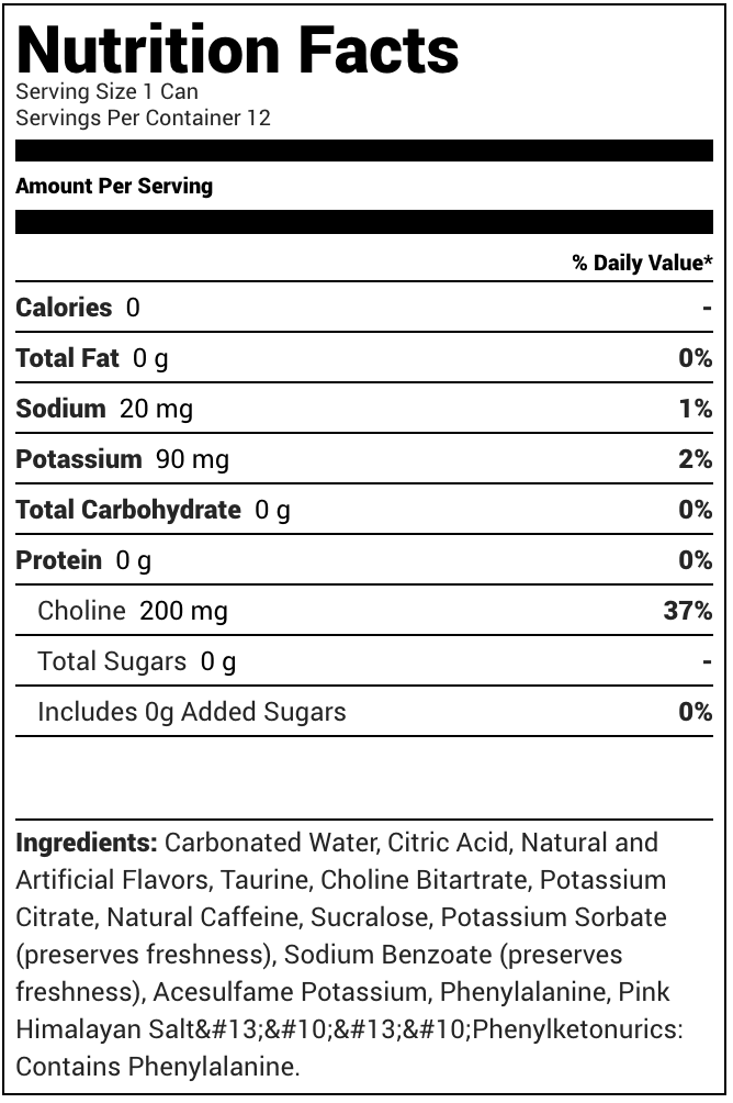 200mg Caffeine Energy Drink. 200mg Choline. Zero Sugar. Clean Energy From 200mg Natural Caffeine. Intense Focus From 500mg Choline Bitartrate. Zero Artificial Colors. 0 Fat Per Serving. Vegan Friendly. Fuel Your Greatness